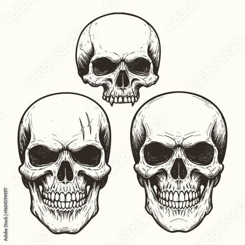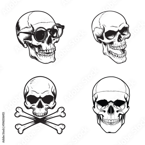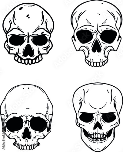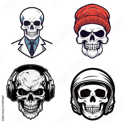 Music skull front view set, vector hand drawn illustration isolated on white background. Human skull with iroquois, beard, wearing hat and cap listening to music using headphones.