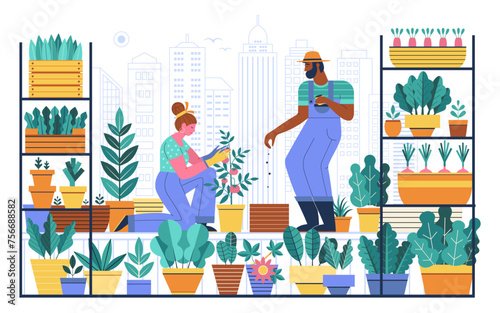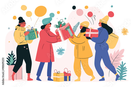 Happy muslim women in perfume store, flat vector illustration. Arab girls in traditional clothing, hijab with shopping bags. Perfumery, department store interior with shelves full of perfume bottles.