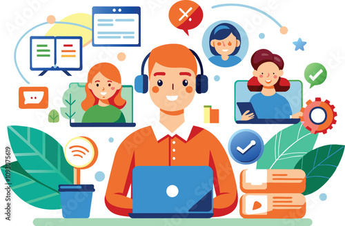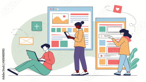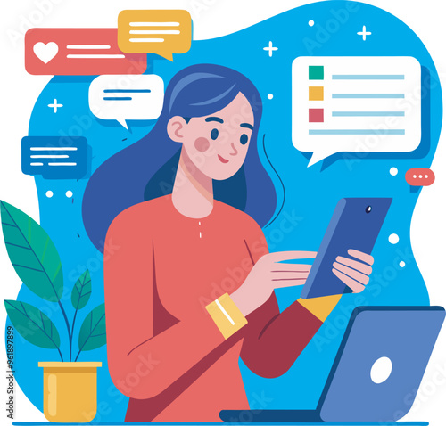 Muslim woman in hijab works with virtual reality screens. Female engineer and data analytic. Diversity and Break the science bias concept vector illustration. Women in tech. Innovative technologies.