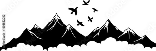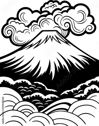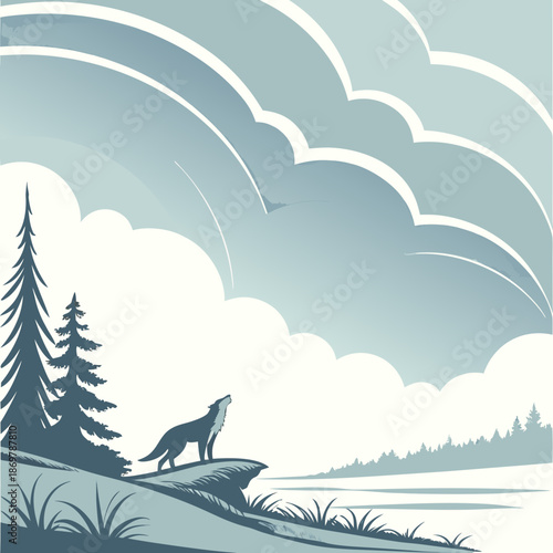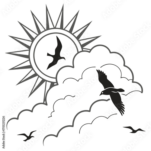 Vector layered paper cut style fluffy clouds and mythological Pegasus, winged horse silhouette. Beautiful fairytale composition.