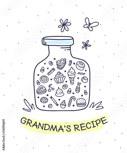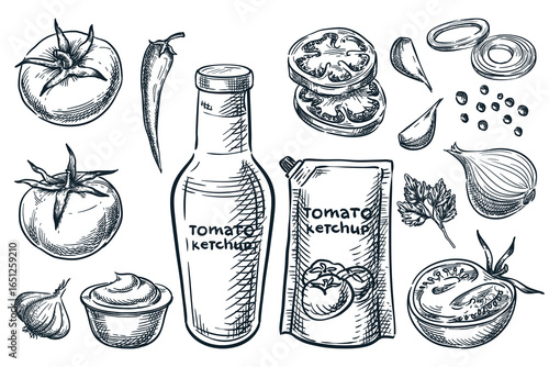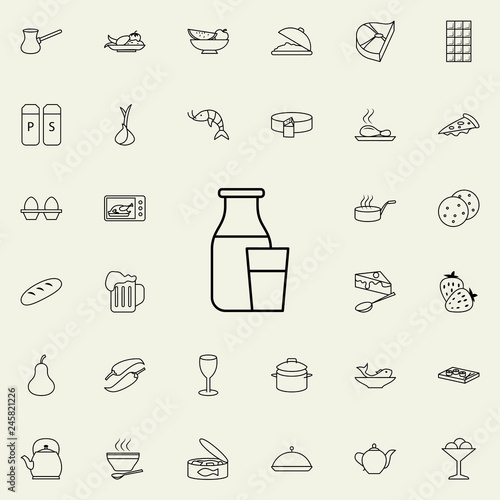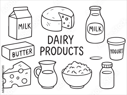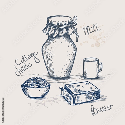 Natural milk ads. Vector realistic glass bottle of milk and ink hand drawn dairy products cheese, yogurt, butter, cream, milk utensils. Natural and delicious milk banner, poster design template.