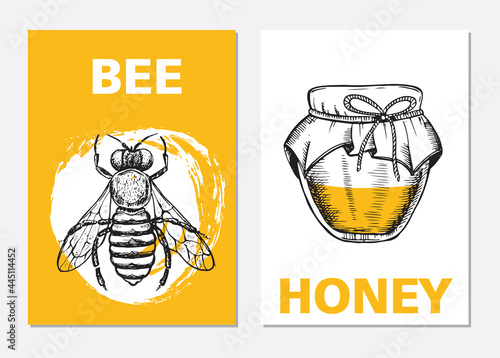 Natural honey card vector. Promotion cover, badge or flyer design template with text. Marketing material for honey products sale