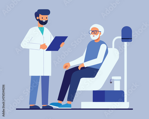 Vector illustration of doctor neurologist examining his patient male with reflex hammer. Medical practitioner flat style design element, icon isolated on white background.
