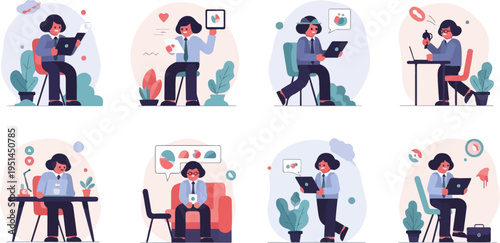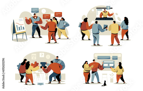 New flight travel rules at airport terminal check-in, vector flat illustration. Pilots stewardesses passengers wearing face masks, health thermal screening. Covid-19 spread prevention during travel.