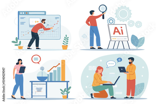 Happy young people male and female characters using mobile phones, vector illustration. Modern means of communication concept for web banner, website page etc.