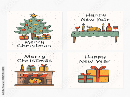 New Year and Christmas scene set, flat vector illustration. Happy women cooking festive dinner, preparing Christmas gifts, couple celebrating winter holidays, Santa Claus giving gift to girl kid.