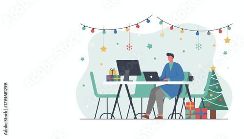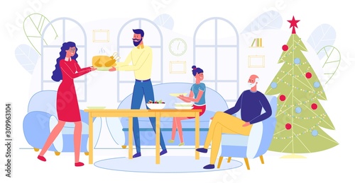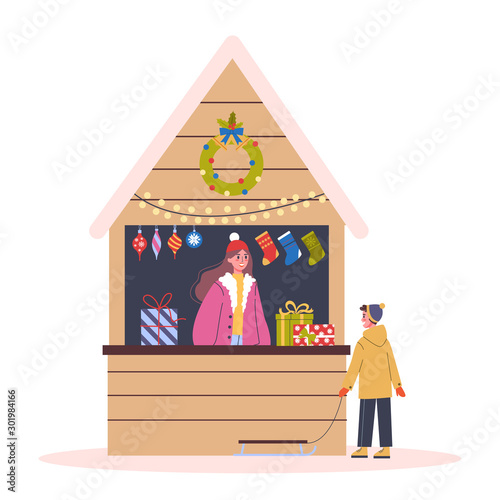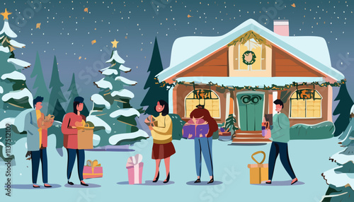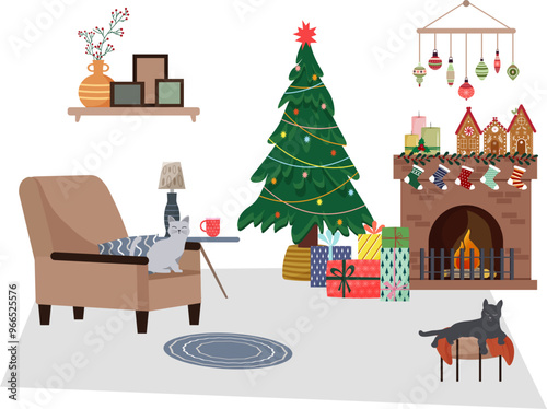 Micro male and female characters decorating fireplace with Christmas wreath, stockings, candles and preparing gifts, vector illustration. Christmas and New Year celebration concept.