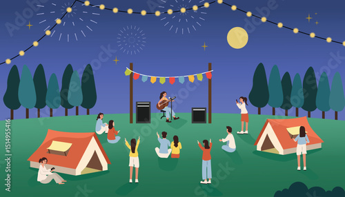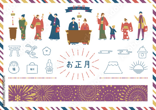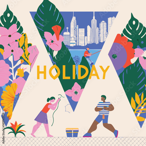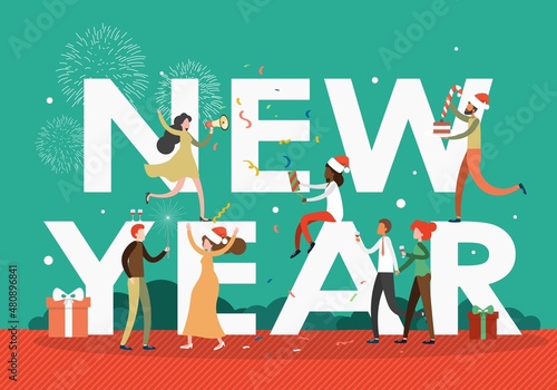 New Year typography banner template. Happy people in Santa hats dancing, drinking wine, having fun, flat vector illustration. New Year corporate party celebration.