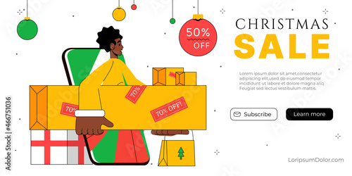 New Year vector website template, web page and landing page design for website and mobile site development. Santa hat, gift boxes, glass of milk with cookies, candy cane, christmas tree and balls.