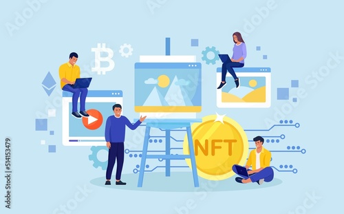NFT artist selling digital artwork to art collector for cryptocurrency, flat vector illustration. Crypto art. NFT blockchain technology.