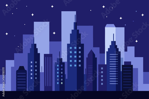 Night city blackout, vector illustration. Cityscape with starry sky, moon and skyscraper building silhouettes without electricity. Dark city skyline. Power outage.