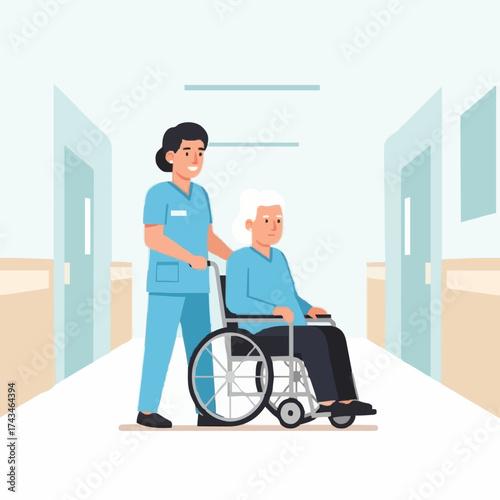 Nurse with disabled patient sitting in wheelchair in hospital, flat vector illustration. Medical care for disabled people. Rehabilitation, recovery.