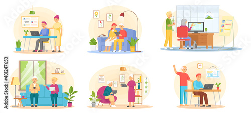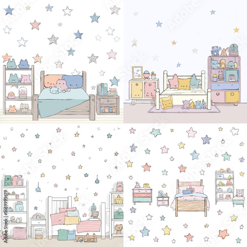 Nursery room interior hand drawn vector illustration set. Home modern interior design. Newborn child room furniture and accessories. Baby crib, colorful wallpaper, kids toys, playground.