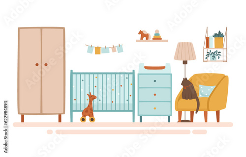 Nursery room interior hand drawn vector illustration. Home modern interior design. Newborn child room furniture and accessories. Baby crib, chair, kids toys, playground.