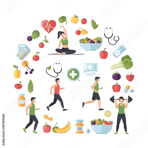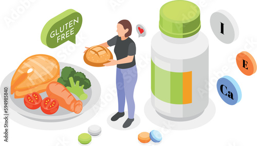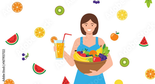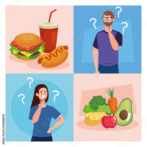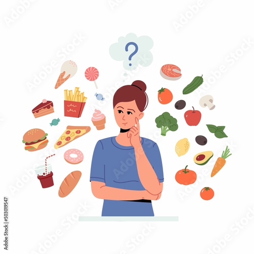 Obesity and weight problems. Young woman choosing between healthy and unhealthy food, flat vector illustration. Weight loss and healthy lifestyle. Junk food vs healthy balanced menu.