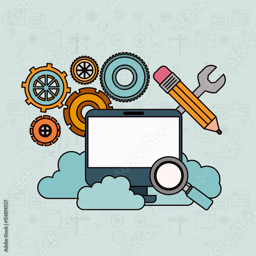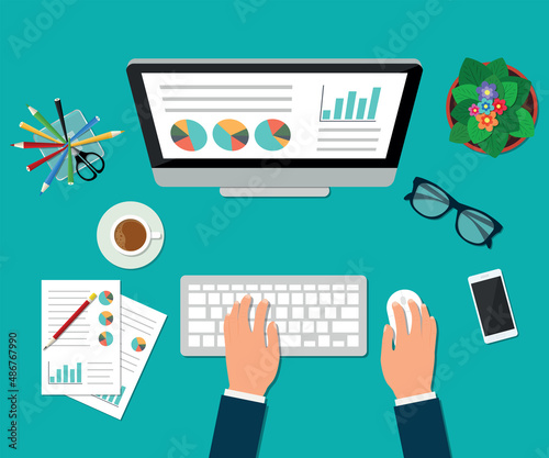 Oculist vector flat illustration. Computer, eye drops, contact lenses container and solution, prescription, trial frame. Optometry, eye test and vision correction equipment for web banner webpage etc.