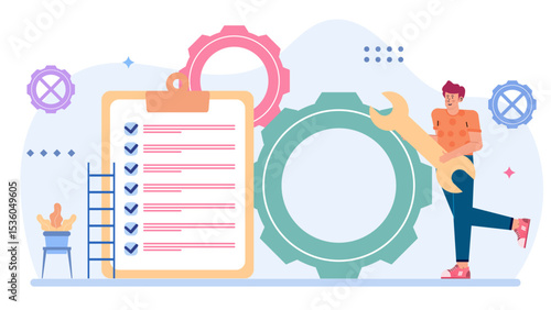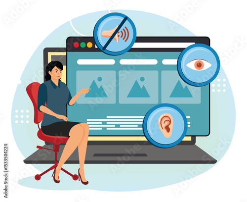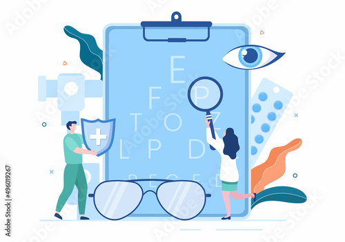 Oculist vector flat illustration. Tiny characters patient and doctor pointing at eye test chart on big computer monitor. Optometry, ophthalmology diagnostics, eyesight test and correction concept.