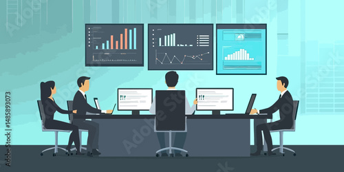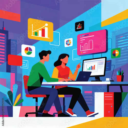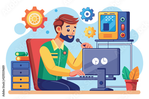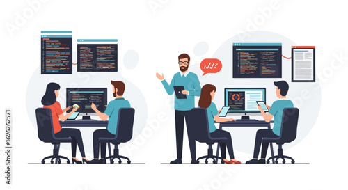 Office workplace and businessman cartoon characters discussing something while working on computer, standing near desk with tablet in hand, vector flat illustration. Businessman daily routine work.