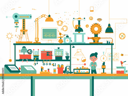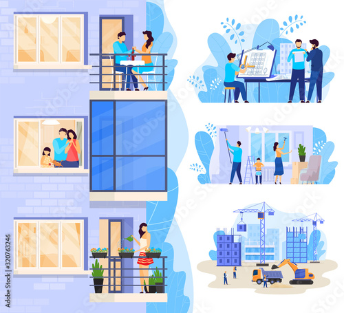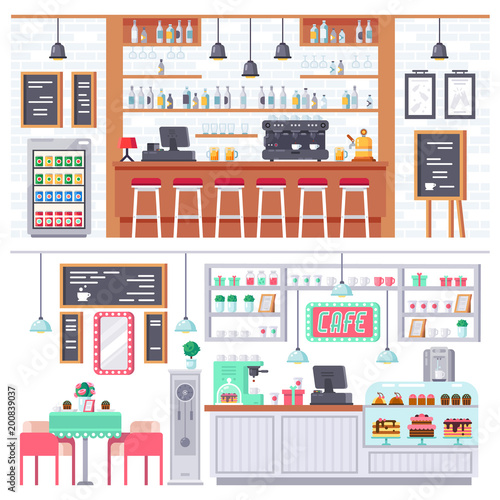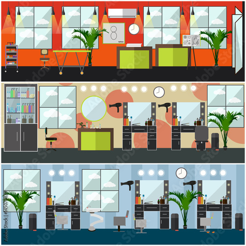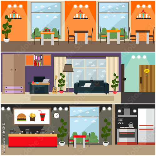 Vector set of posters, banners with modern workspace interior with furniture, computer equipment and office supplies. Office life concept, flat style design elements.