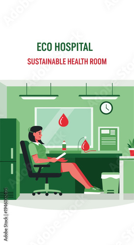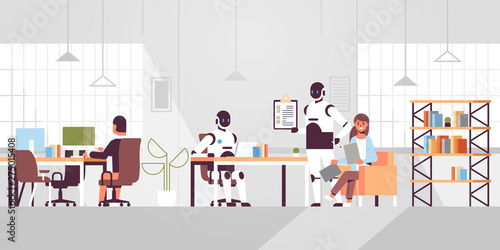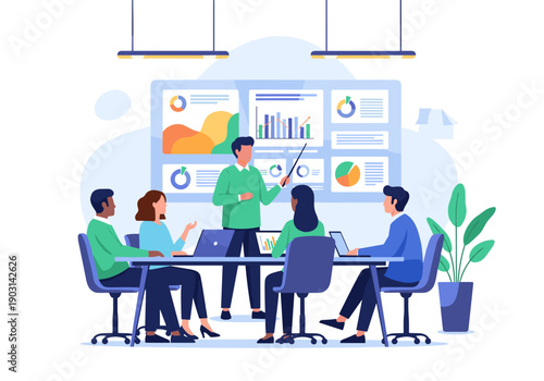 Vector illustration of modern workspace interior with office furniture and equipment, employees working on laptop, meeting with partners. Office life concept, flat style design.