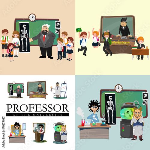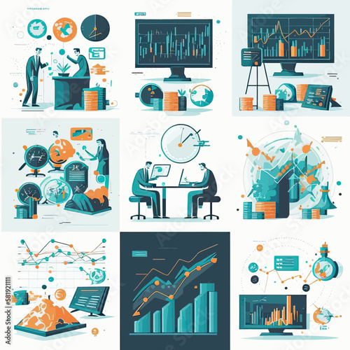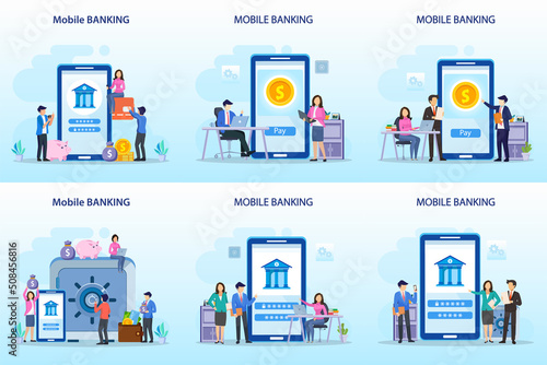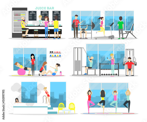 Vector set of posters, banners with modern workspace interior and employees working on laptop, meeting with partners, giving presentation, taking coffee break. Office life concept, flat style design.