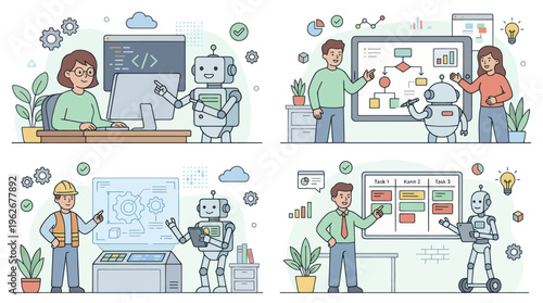 Vector set of posters, banners with modern workspace interior, business people giving presentation, meeting, dealing, signing contracts with partners. Office life concept, flat style design elements.