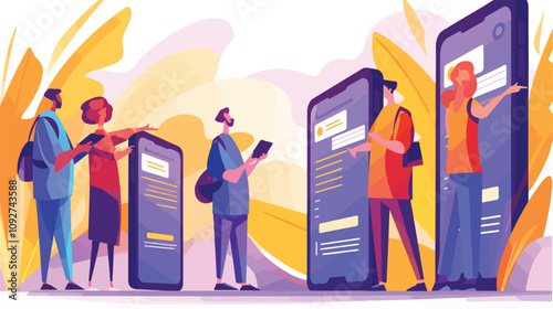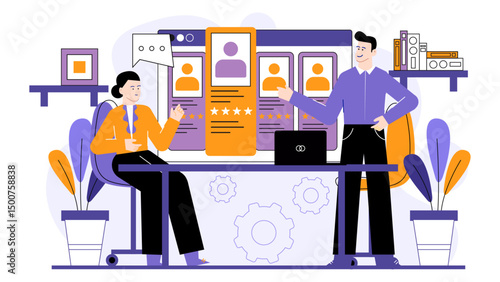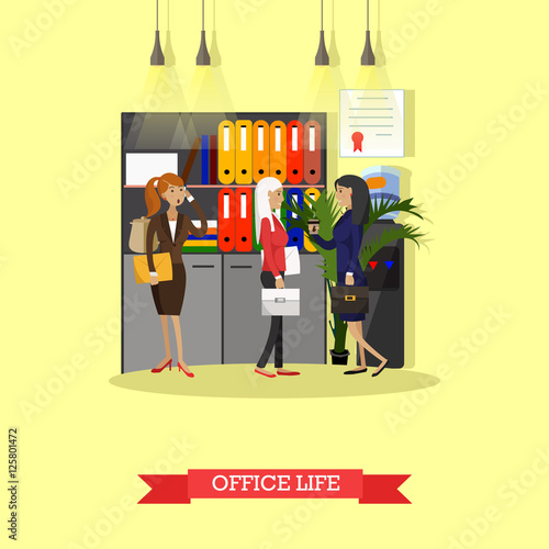 Office life concept vector illustration in flat style. Female workers in office interior. Women have coffee break and talk next to office cooler.