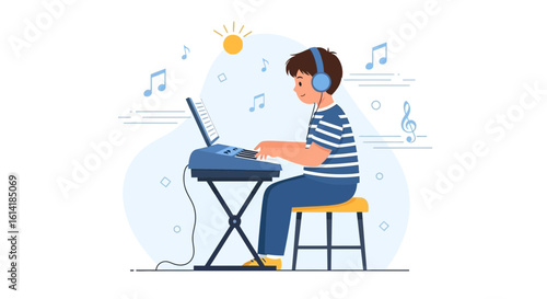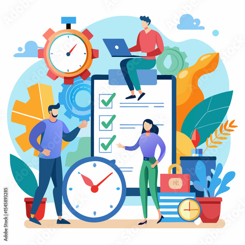 Office man working on laptop. Clock, target, checklist business symbols, flat vector illustration. Time management, schedule, task planning.