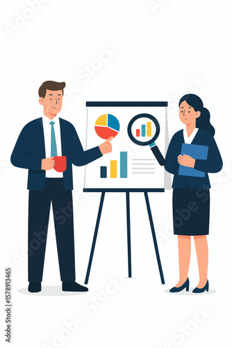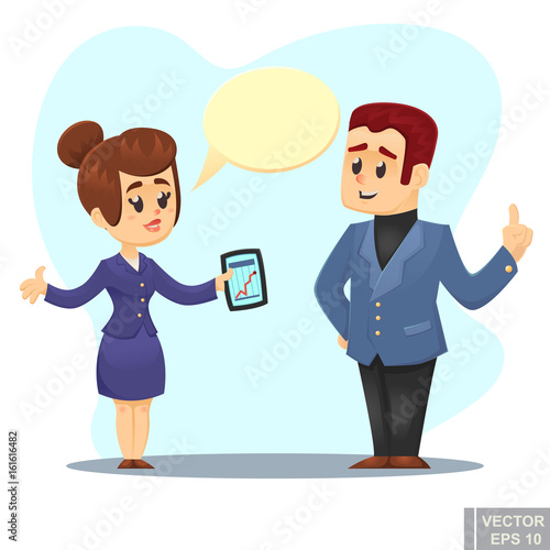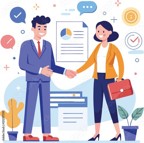 Vector illustration of businessman and businesswoman making a great deal and shaking hands. Office people flat style design elements, icons isolated on white background.