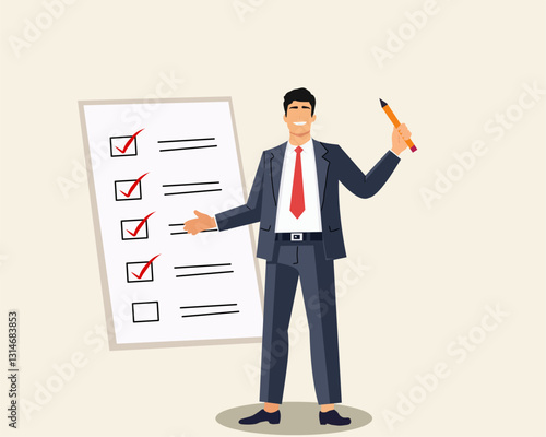 Vector illustration of smiling businessman in suit standing with one hand in pocket. Office people flat style design element, icon isolated on white background.
