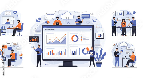 Business people in different office situations, vector flat illustration. Miniature male and female characters working on laptop, taking coffee break. Office daily routine, time management composition