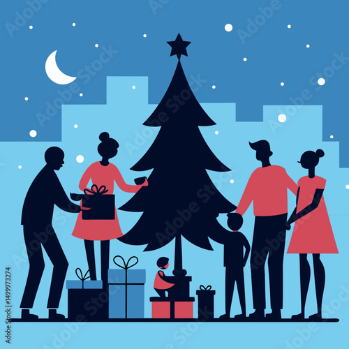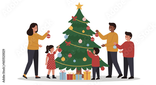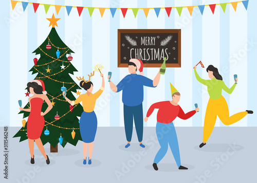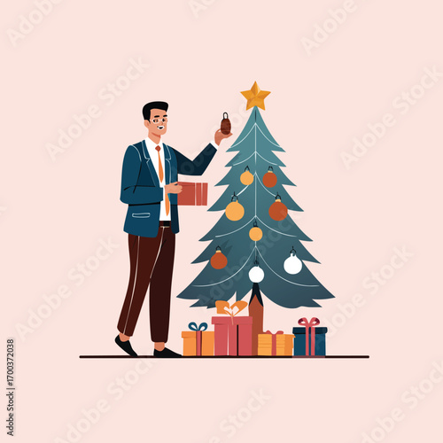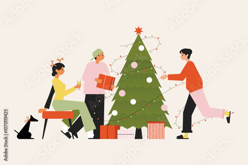 Tiny office people decorating giant Christmas tree and preparing gifts to put them under the tree, flat vector illustration. Preparation for Merry Christmas and New Year holidays party celebration.