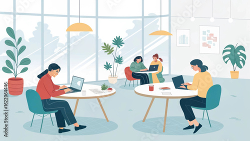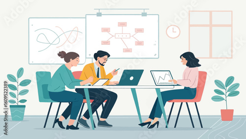 Business people planning, discussing problems sitting at table in office, flat vector illustration. Business meeting, workshop, teamwork, brainstorm, training.