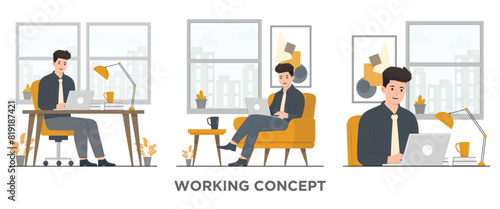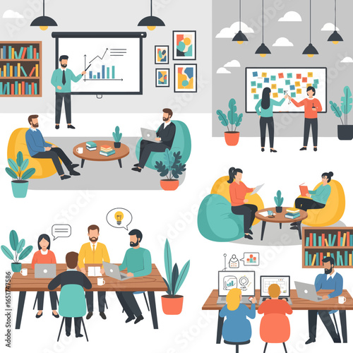 Office scene set, flat vector isolated illustration. Business people working on computer, taking coffee break, giving presentation, meeting, training, planning their work. Office situations.