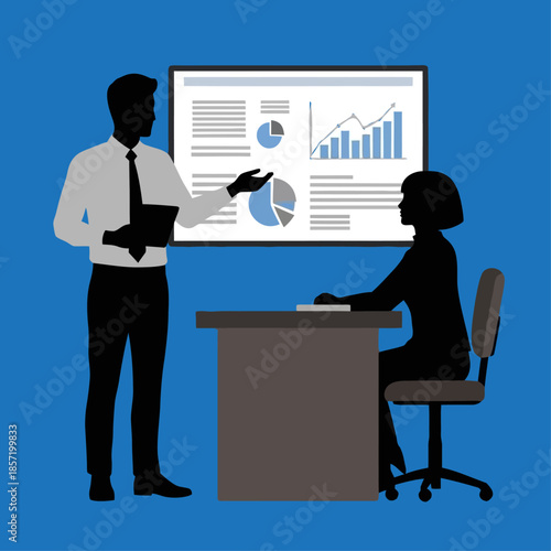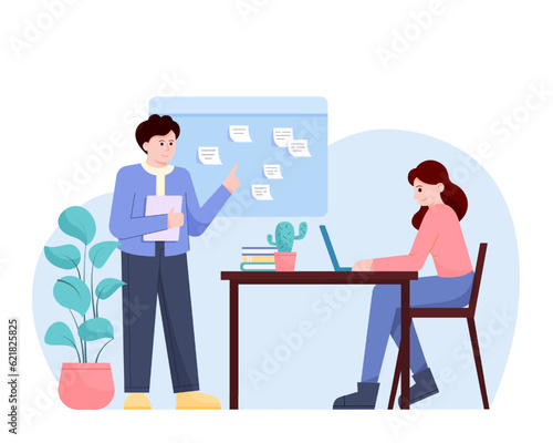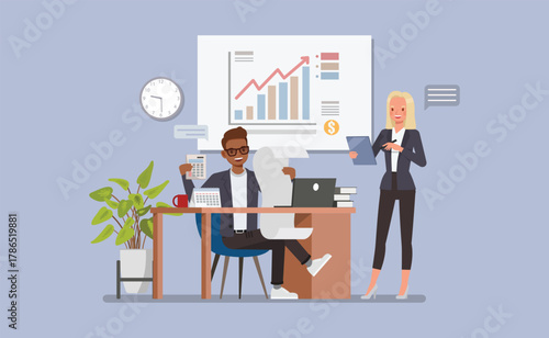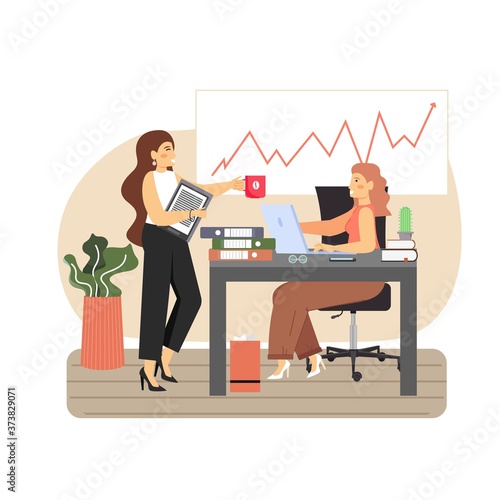 Office scene with modern workplace, two business women colleagues taking coffee break and talking to each other, vector flat illustration. Work schedule, lunch time, office situation, time management.