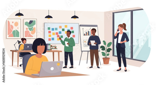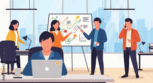 Office team scene set, flat vector isolated illustration. Business people meeting, discussion, partnership, handshake, workshop, presentation, best deal. Team work concept.
