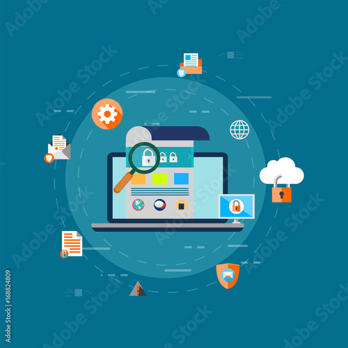 Office work vector flat illustration. Desktop computer, smartphone, clipboard with contract form, stationery, photo in frame and hand drawing with pencil on monitor. Office workspace poster, banner.