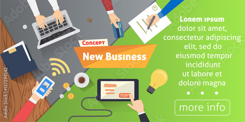 Office work vector flat illustration. Laptop with world map on screen , cactus, cup of tea, desk lamp, folders, watch, paper money and hand with dollar coin. Office workplace, workspace poster, banner