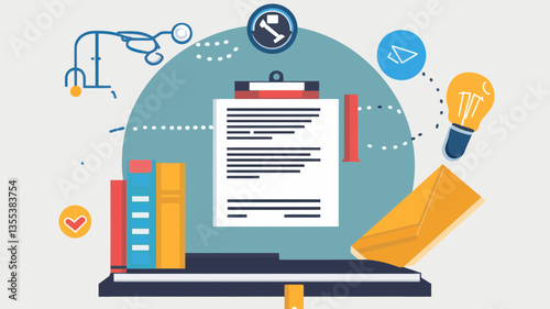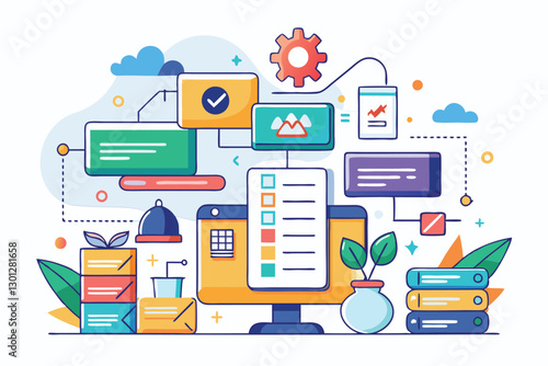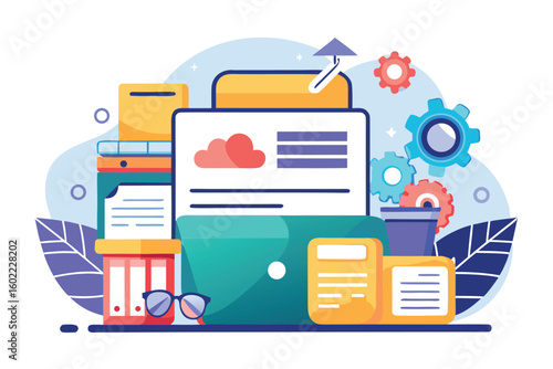 Office work vector flat style design illustration. Desktop computer, smartphone, mouse, purse with dollar coin, notepad, cactus and cup of tea. Office workplace poster, banner.