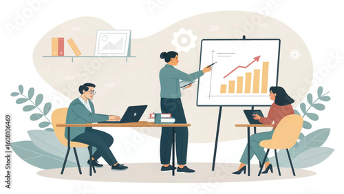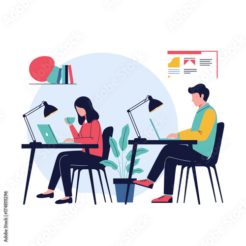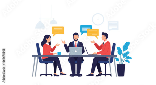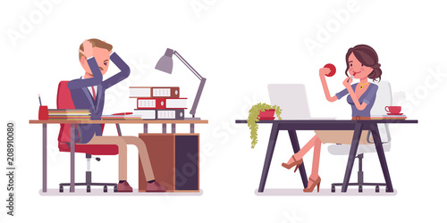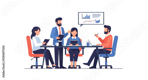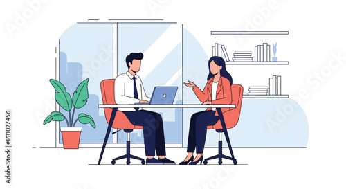 Business people at work, vector flat style design illustration. Woman showing document to man sitting at table. Office work concept for web banner, website page etc.