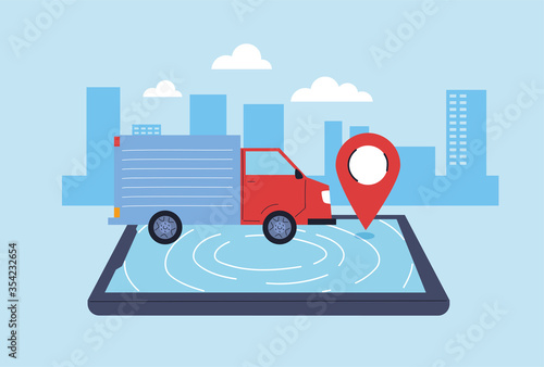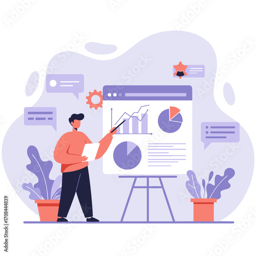 Office people with lamp and magnifying glass looking at world map on huge desktop computer screen, vector flat style design illustration. Office situations, teamwork, money making concept.