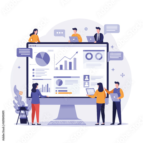 Business man climbing up growing bar graph to trophy cup, woman working on laptop, vector flat style design illustration. Office work, business career concept for web banner, website page etc.