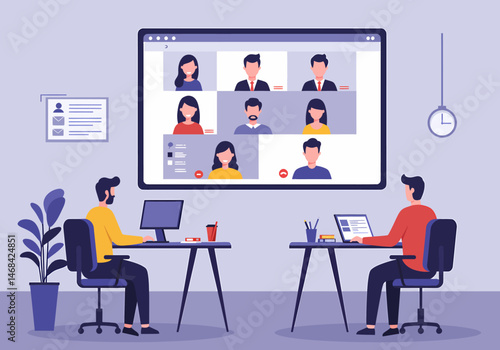 Office work, flat vector illustration. Business people giving presentation, meeting and discussing problems. Partnership, handshake, workshop, team work. Office situations.