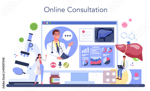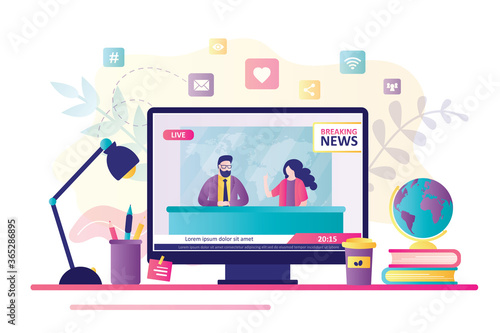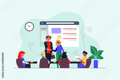Office work vector poster template. Huge smartphone, computer with workplace, charts on screens, office people meeting, shaking hands, working on laptop computer, flat style design illustration.