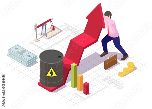 Oil price growth vector scene. Businessman arrow growing up. Petroleum tank container, statistic chart and graph stock trade market, money cash stack flat design
