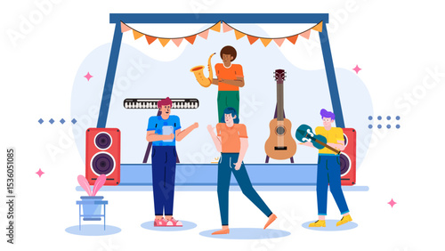 Huge beer mug, micro male characters having fun, woman holding big sausage, vector illustration. Oktoberfest celebration composition for web banner, website page etc.