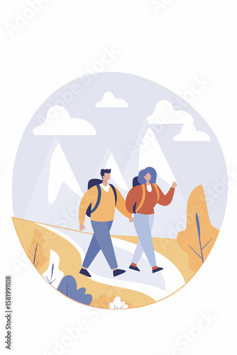 Huge pretzel and beer mug, happy male and female characters talking to each other, holding hops and beer mugs, vector illustration. Oktoberfest celebration composition for web banner, website page etc
