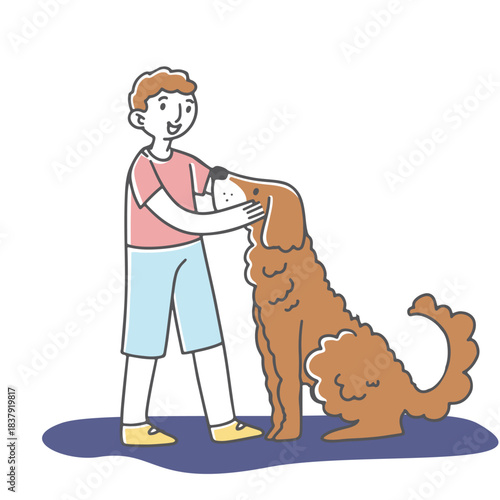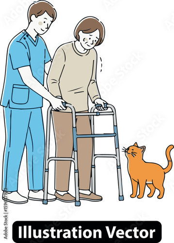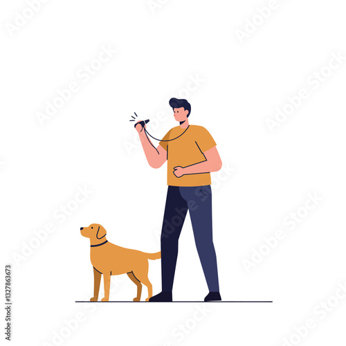 Old man carrying shopping bag walking his dog and drinking water vector icon isolated background.