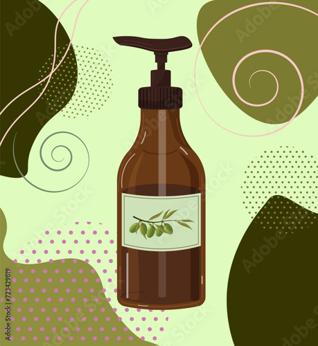 Olive oil ads. Vector realistic illustration of olive oil glass bottle packaging mockup, ink hand drawn olive fruit, branch, tree and olive oil glass pitcher.