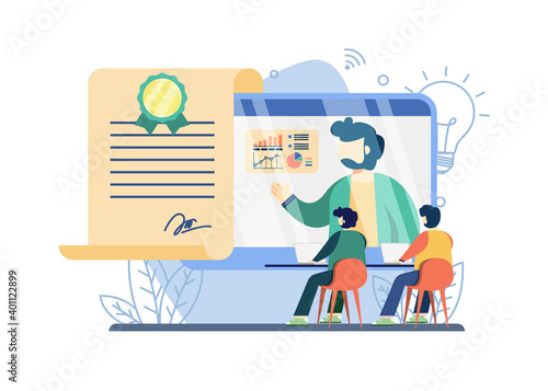 Vector illustration of big computer with wallet on screen, customers cartoon characters with credit card, money. Online banking services concept for web banner, website page etc.